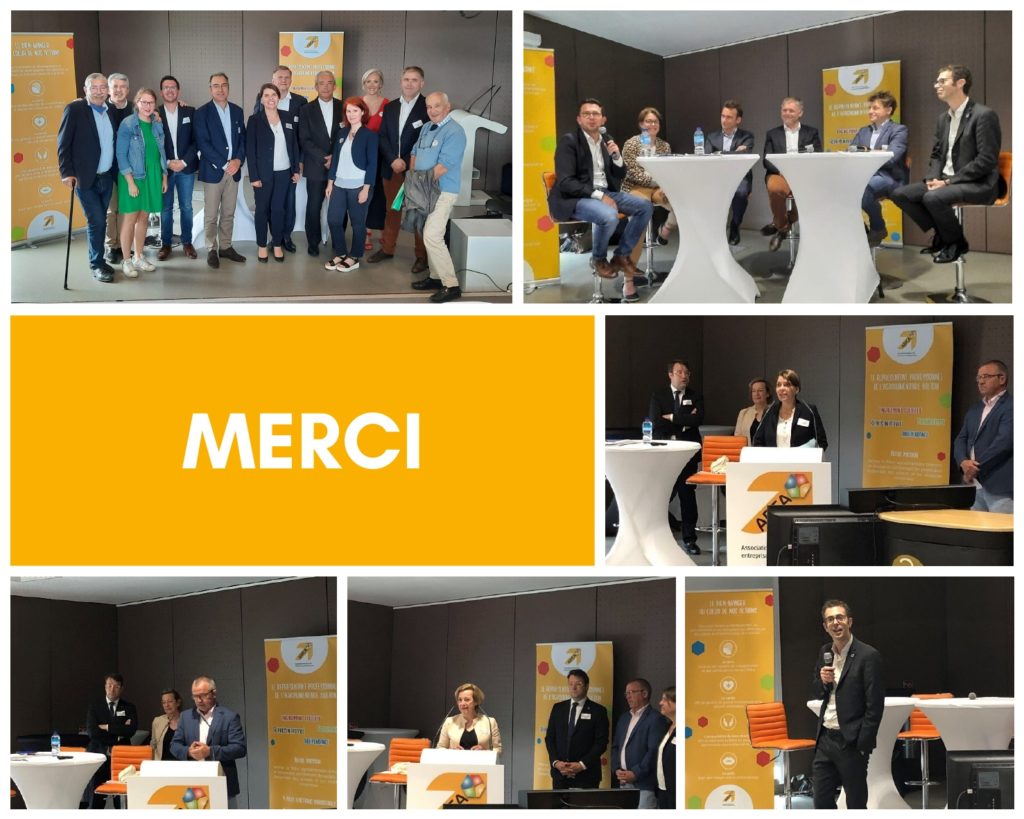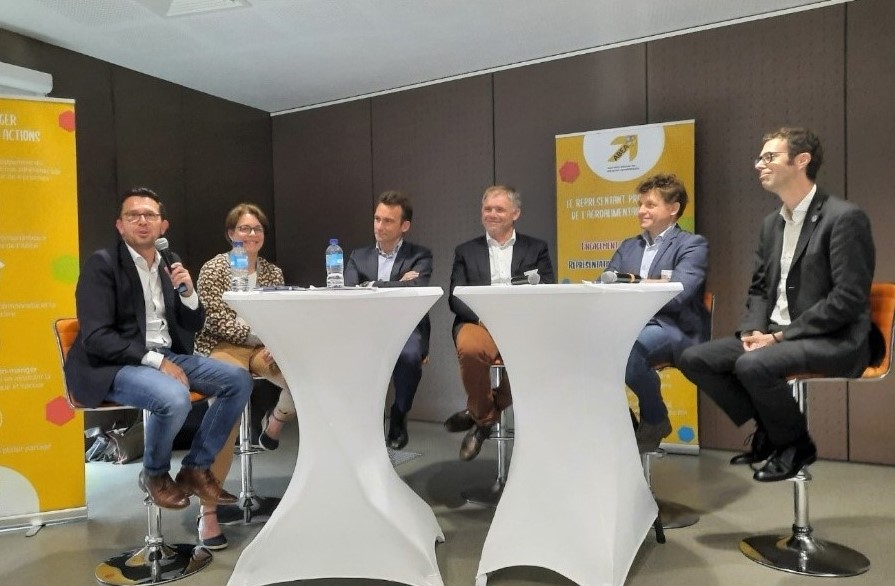 Table ronde avec Sébastien FLOC’H, DG SILL, Magali HAOUISEE, Directrice de site Charcuteries cuisinées de PLELAN (groupe FLEURY MICHON), Pierre-Yves JESTIN, Président de la Coopérative Agricole de l’Ouest (SAVEOL), Fabrice CHAPELLE, DG ABERA, Christophe LE BIHAN, Directeur groupe MYTILIMER, et Nicolas BOUZOU, Économiste et Directeur du cabinet de conseil « Asterès ».