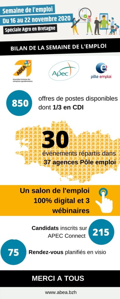 La semaine de l’emploi spéciale agroalimentaire s’est déroulée du 16 au 22 novembre dernier. Avec, entre autres, plus de 30 temps forts répartis dans les 37 agences Pôle emploi bretonnes et un job dating 100% digital, cette première édition a été un franc succès.