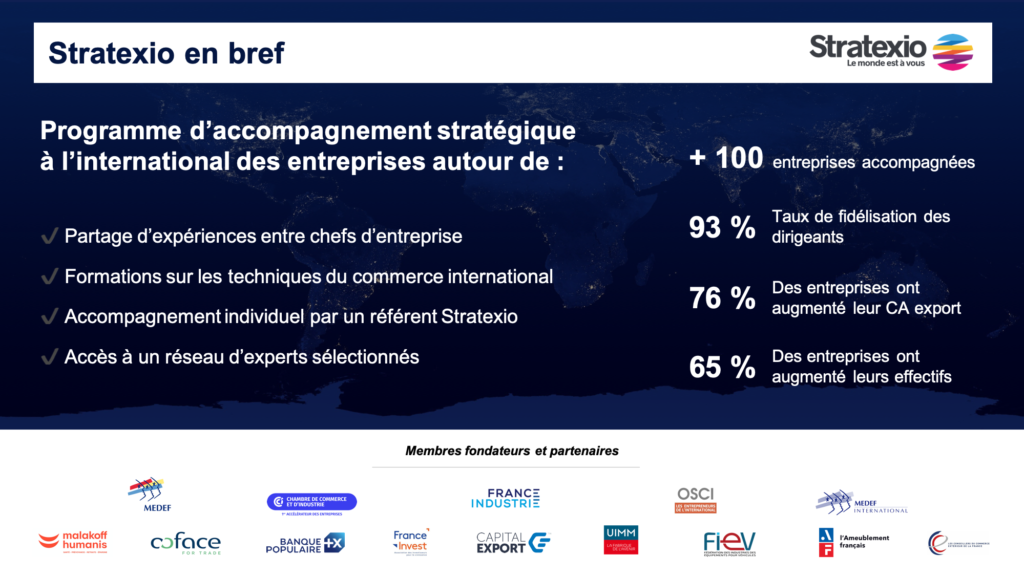 Créé notamment par des chefs d’entreprise du MEDEF et de ses branches adhérentes, Stratexio aide les dirigeants à structurer leur projet de développement international, en s’appuyant sur un large panel d’experts spécialistes du commerce international et sur un réseau de partenaires ciblés.