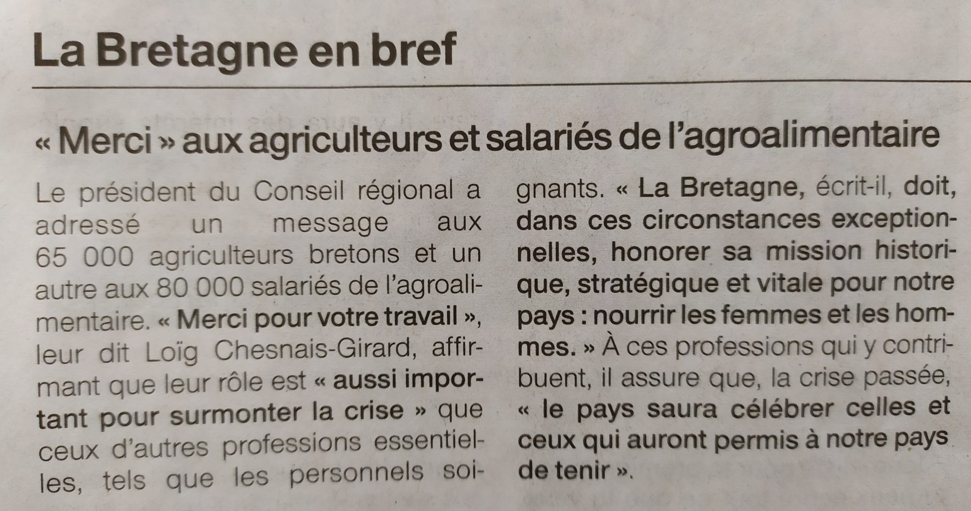 - Lettre du Président de Région aux salariés de l’agroalimentaire (19/03/2020)
