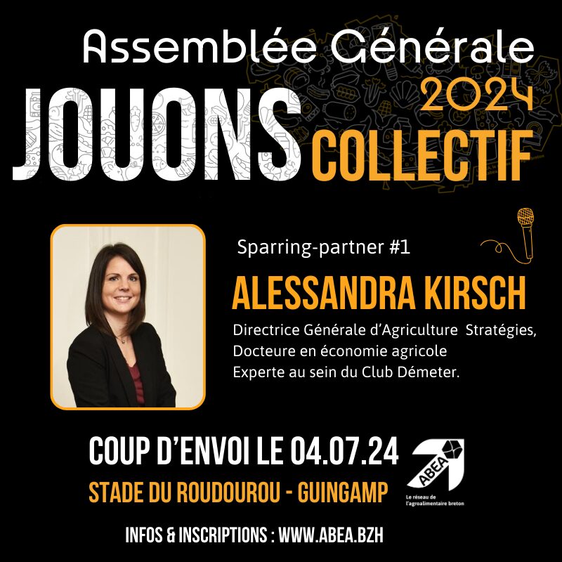 Cette année, nous avons le plaisir d’accueillir comme sparring-partner #1 : Alessandra Kirsch, Directrice Générale d’Agriculture Stratégies, Docteure en économie agricole et Experte au sein du Club Déméter. Elle partagera son expertise sur les impacts et transitions de notre modèle alimentaire, abordant les aspects économiques, environnementaux et géopolitiques.