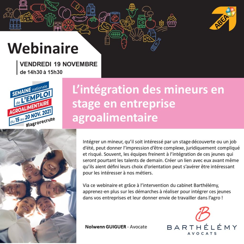 - Vendredi 19 novembre à 14h30 : Visioconférence RH organisé par l’ABEA sur l’intégration des mineurs en entreprises agroalimentaires
