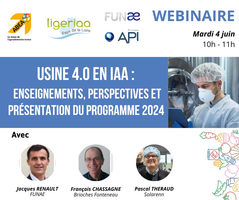 Après 3 promotions du programme Destination Usine 4.0 mené par l’ABEA et LIGERIAA, profitez d’une heure pour bénéficier des enseignements suite aux travaux menés par ces promotions. L’ABEA et LIGERIAA partageront également les résultats d’une enquête menée fin 2023 sur les enjeux et perspectives liées à la digitalisation et à la performance industrielle pour les IAA bretonnes et ligériennes.
